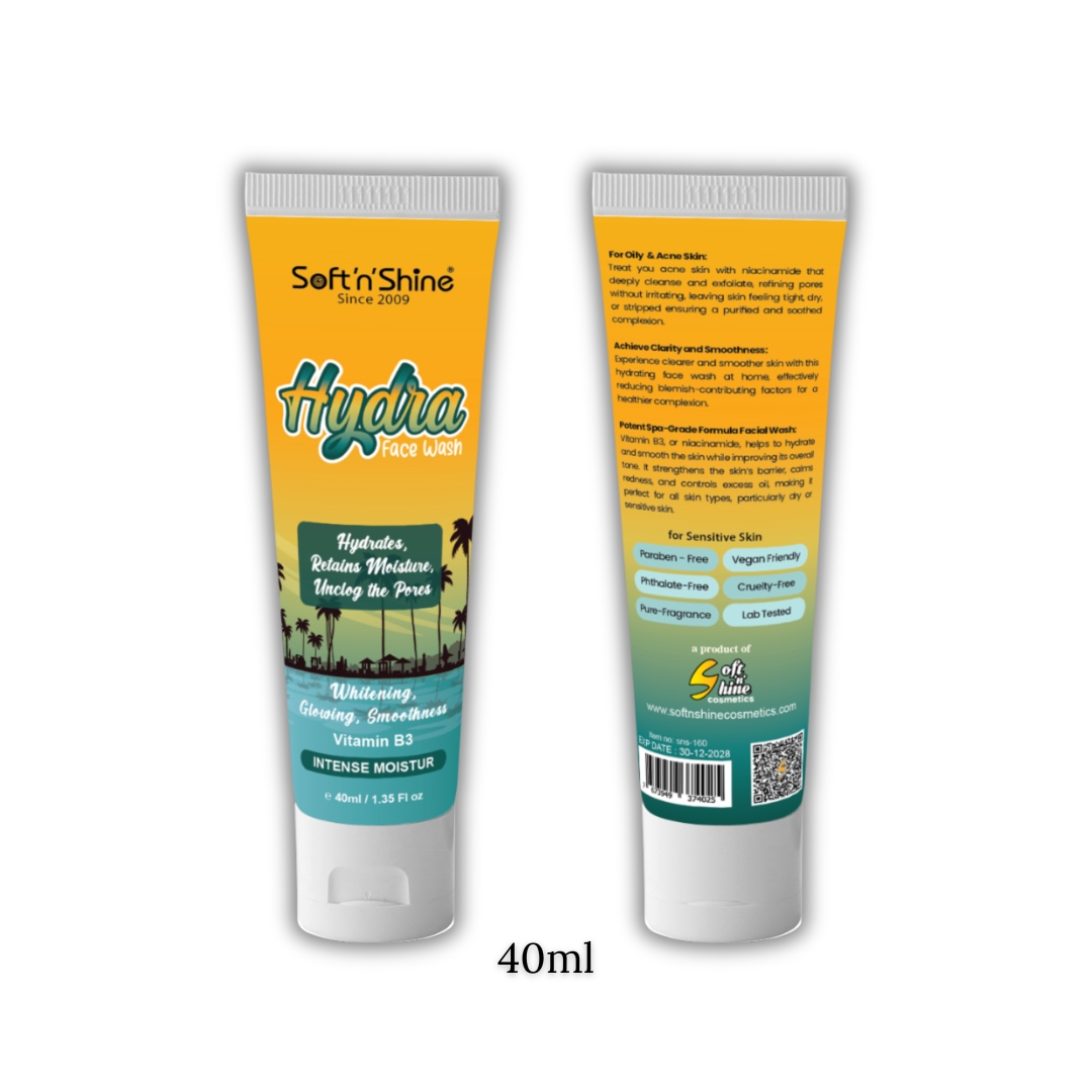 Refresh your skin with the deep hydration of Hydra Face Wash by Soft n Shine. Formulated with Vitamin B3 (Niacinamide), this spa-grade cleanser helps retain moisture, purify pores, and promote visibly clearer, smoother skin.