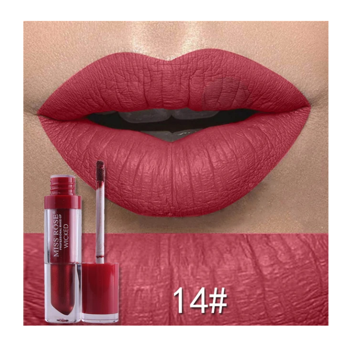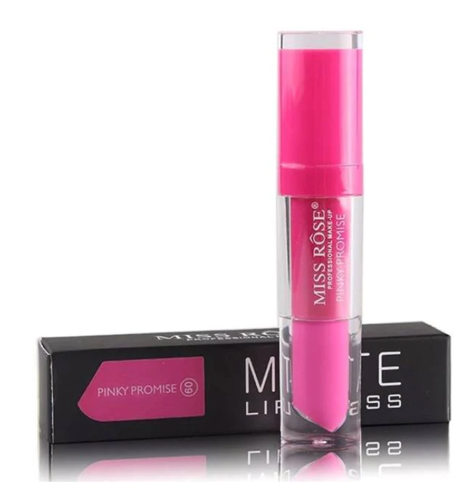Introducing MISS ROSE Black Matte Lip Gloss . A smooth , velvety , matte lipstick that drenches lips in rich , long – wearing and transfer – proof color . Our unique formula applies as a creamy liquid and dries down to a comfortable matte finish with rich color payoff .